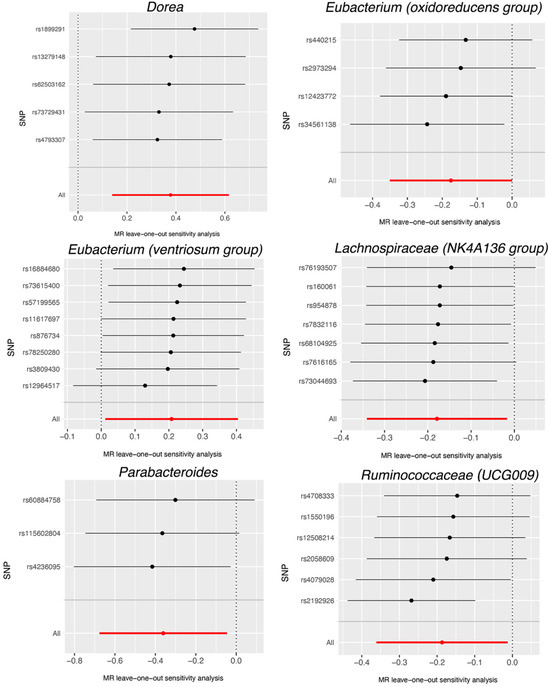 Leave-one-out plots for the causal association between gut microbiota (Dorea, Eubacterium (oxidoreducens group), Eubacterium (ventriosum group), Lachnospiraceae (NK4A136 group), Parabacteroides and Ruminococcaceae (UCG009), and AMD. The leave-one-out plot presents how the causal estimates (point with horizontal circle) for the effect of gut on AMD were influenced by the removal of a single variant. The bars indicate the confidence interval of MR estimates. AMD, age-related macular degeneration. SNP, single nucleotide polymorphism.