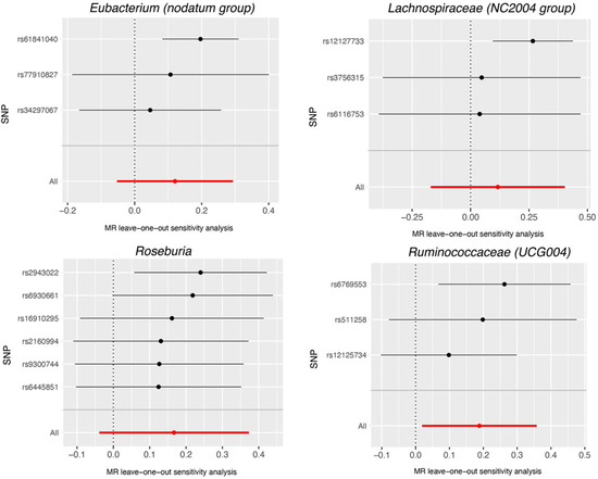 Leave-one-out plots for the causal association between gut microbiota (Eubacterium (nodatum group), Lachnospiraceae (NC2004 group), Roseburia and Ruminococcaceae (UCG004), and glaucoma. The leave-one-out plot presents how the causal estimates (point with horizontal circle) for the effect of gut on glaucoma were influenced by the removal of a single variant. The bars indicate the confidence interval of MR estimates. SNP, single nucleotide polymorphism.