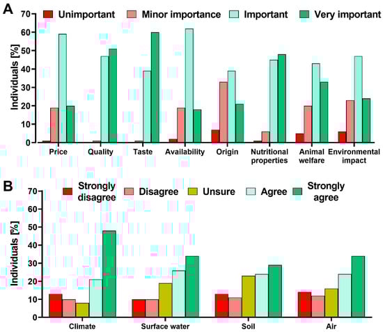 - factors influencing food purchases of surveyed individuals, including price, quality, taste, availability, origin, nutritional properties, animal welfare, and environmental impact;