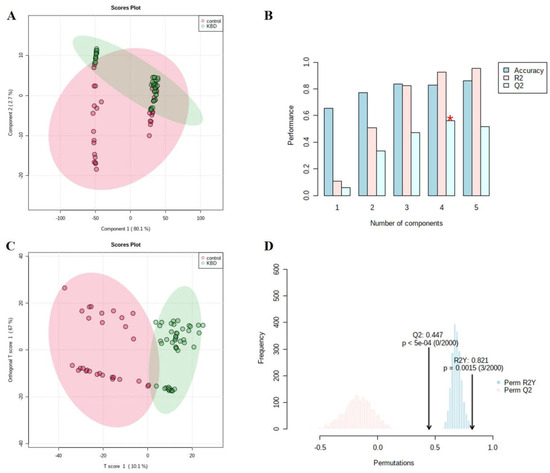 Multivariate statistical analysis results of PLS-DA and OPLS-DA: (A) PLS-DA score plots of KBD and control groups; (B) validation of the PLS-DA model by cross validation, under different number of components. The red star indicates the best classifier; (C) OPLS-DA score plot of KBD and control groups; and (D) OPLS-DA model validation with permutation tests (2000 permutations p < 0.01) and cross validation (R2Y = 0.821 and Q2 = 0.441).