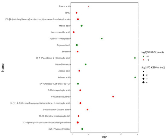 The scatter plot of the differential metabolites with the top 20 VIP value between KBD vs. control. X indicates the value of VIP. The higher VIP a metabolite has, the more contribution it provides in the group separation. The color indicates the upregulation (log2FC > 0) and downregulation (log2FC < 0). The size of the spot indicates the absolute value of log2FC.