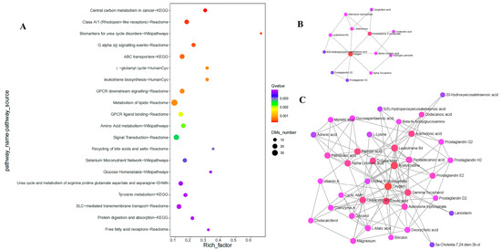 The results of pathway analysis (A) and the interaction of differential metabolites (B,C). (A) shows the top 20 smallest Q-value pathways (all Q value < 0.05), (B) shows the interaction of differential metabolites from the significant pathway of selenium micronutrient network (Wikipathways), and (C) shows the interaction of differential metabolites from significant pathways of metabolism of lipids (Reactome) and free fatty acid receptors (Reactome).