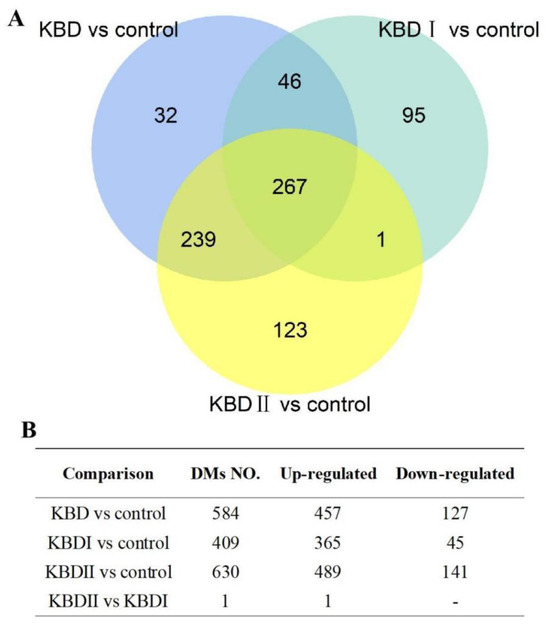 The summary of results in different comparisons: (A) shows the Venn plot of differential metabolites number from KBD vs. control, KBD II vs. control, and KBD I vs. control as well as their overlapping and (B) summarizes the number of differential metabolites from KBD vs. control, KBD II vs. control, KBD I vs. control, and KBD II vs. KBD I.