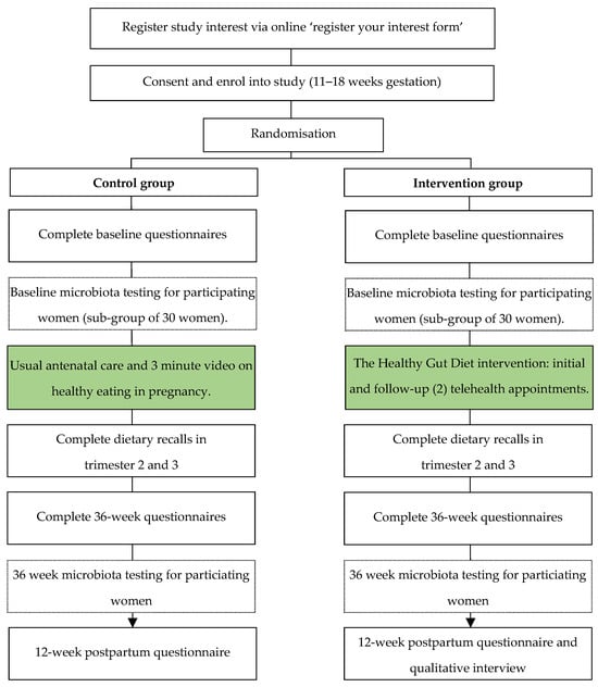 Women in both groups receive an AUD 50 grocery store gift voucher after completing the baseline questionnaire and trimester 2 dietary intake records, and a second AUD 50 grocery store gift voucher will be received upon completion of the 36-week questionnaire and trimester 3 dietary intake records. All participants will be invited to complete a 12-week post-partum follow-up questionnaire and will receive a third AUD 25 grocery store gift voucher upon completion. Women in the intervention group will also be invited to participate in a short phone interview that will explore the barriers and enablers of the Healthy Gut Diet (both within pregnancy and longer term). Women who undertake gut microbiota analysis will receive a personalized report (Insight report) generated by a third-party laboratory, Microba [].