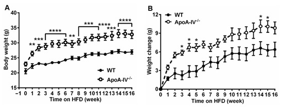 The progression of obesity in apoA-IV−/− mice over a 16-week HFD study. (A) Body weight. (B) Body weight change. Data are depicted as mean ± SEM (n = 6) and analyzed statistically via regular two-way ANOVA. Significant differences relative to the WT group (* p < 0.05; ** p < 0.01; *** p < 0.001; **** p < 0.0001).