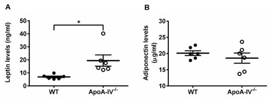 Secreted by adipose tissues, leptin and adiponectin are known to be associated with obesity [24,25]. Therefore, plasma leptin and adiponectin levels were measured via ELISA on Week 16 of HFD feeding. In comparison to WT mice, leptin levels were significantly higher in apoA-IV−/− mice (Figure 3A), consistent with the notion that leptin concentrations are positively correlated with the percentage of body fat [24]. Adiponectin levels, inversely related to obesity [25], were slightly lower in apoA-IV−/− mice (Figure 3B).