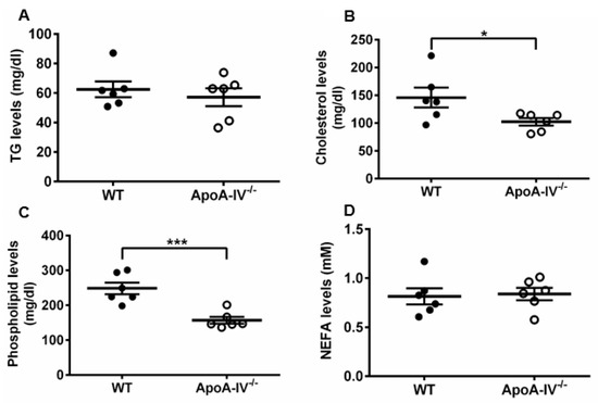 Lipid profile analysis of WT and apoA-IV−/− mice at the end of 16-week HFD study. (A) Circulating triglycerides (TG) levels. (B) Cholesterol levels. (C) Phospholipids levels. (D) Non-esterified fatty acid (NEFA) levels. Black circles indicate WT mice and white circle indicate ApoA-IV−/− mice. Data are depicted as mean ± SEM (n = 6) and analyzed statistically via student t-test. Significant differences relative to the WT group (* p < 0.05; *** p < 0.001).
