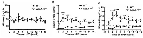 Glucose homeostasis in WT and apoA-IV−/− mice during 16-week HFD study. (A) Blood glucose levels. (B) Plasma insulin levels. (C) HOMA-IR. Data are presented as mean ± SEM (n = 6) and analyzed statistically via regular two-way ANOVA. Significant differences relative to the WT group (* p < 0.05; ** p < 0.01; *** p < 0.001; **** p < 0.0001).