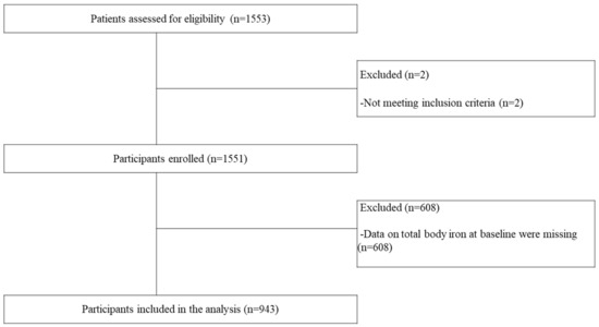 In December 2009, the University of Miyazaki, Japan, initiated a prospective observational study (Miyazaki Dialysis Cohort Study) that included 943 patients on maintenance HD from 27 dialysis centers. The follow-up period of the study was 5 years. The final analysis of this study excluded patients with ≤3 months of dialysis vintage; who were aged <18 years; or who were pregnant, hospitalized, or unwilling to participate. Patients receiving iron supplements/infusions/medications were not excluded (Figure 1).