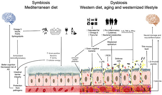 It is important to highlight that the composition of the GM is influenced by diet. Therefore, a healthy dietary pattern is an efficient way to prevent or delay the progression of AD. The MD, being rich in monounsaturated and polyunsaturated fats, could act preventively or provide relief from symptoms by reversing neuroinflammation and modifying the intestinal and blood–brain barriers in AD. On the other hand, the Western diet, characterized by high consumption of saturated and trans fats, combined with a sedentary lifestyle, inadequate sleep, and chronic stress, could intensify the progression of AD by promoting dysbiosis and alterations in the intestinal and blood–brain barriers, as well as chronic inflammation.