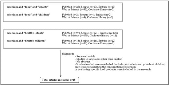 Relevant articles regarding Se in the diet of infants and children were retrieved from PubMed, Scopus, Web of Science, Embase, and Cochrane Library using the following keywords: “selenium” and “food products” and “healthy children” or “selenium” and “food products” and “healthy infants”. An additional search was performed for selenium content” and “healthy children” or “selenium content” and “healthy infants”. Duplicate articles and studies in languages other than English or adults were excluded.