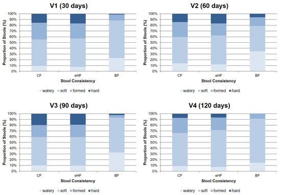 Soft stool was also the predominant consistency in BF at all visits (ranging from 43.9 ± 22.6% of stools at V2 to 76.5 ± 19.8% at V4), followed by watery stool (ranging from 14.7 ± 15.9% of stools at V4 to 34.7 ± 22.0% at V2). In a descriptive comparison, BF had a higher prevalence of watery stools than FF and lower prevalence of formed and hard stools throughout the study period.
