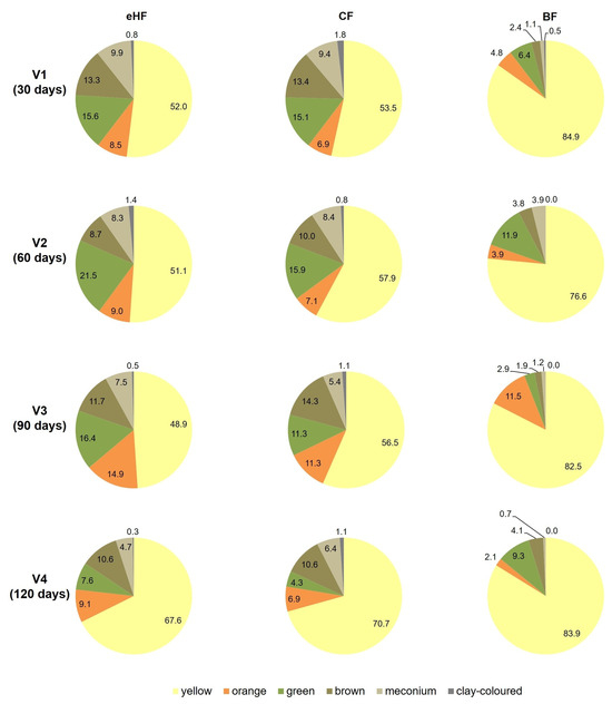 Also in BF, the majority (>75%) of stools were yellow throughout the study period (V1: 84.9 ± 17.7%; V4: 83.9 ± 20.9%). Each of the other colours was observed in less than 12% of the stools reported at each visit (Figure 4).
