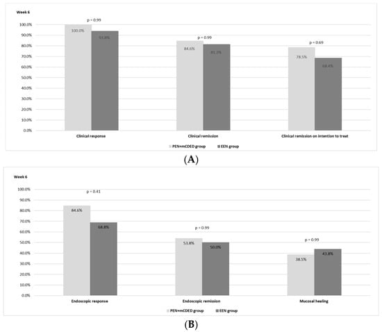 The clinical outcomes after 6 weeks of the nutritional treatment for both groups are shown in Figure 2A. There was no statistically significant difference observed between the PEN and the EEN groups regarding the rate of clinical remission. In the PEN + mCDED group, clinical remission (PCDAI < 10) on ITT analysis was achieved in 11/14 (78.5%) patients; in the EEN group, 13/19 (68.4%) patients achieved clinical remission (p = 0.69). Clinical remission in the per-protocol analysis was observed in 11/13 (84.6%) patients in the PEN + mCDED group and in 13/16 patients (81.3%) in the EEN group (p = 0.99). A clinical response was achieved in all patients (13/13) in the PEN + mCDED group and in 15 out of 16 (93.8%) in the EEN group.