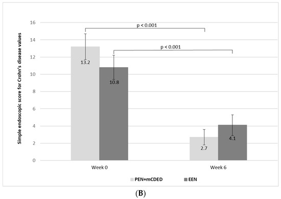 The mean values of PCDAI significantly decreased from the baseline to the end of the treatment in both groups (from 31.2 to 2.7 (standard error (SE)) to 7.1 (SE 1.4) at Week 3 and to 3.8 (SE 1.3) at Week 6 in the PEN + mCDED group (p < 0.001), and from 31.1 (SE 2.8) to 6.6 (SE 2.1) at Week 3 to 5.5 (SE 2.0) at Week 6 in the EEN group (p < 0.001). There was no significant difference in the decrease in mean PCDAI between the groups during the 6-week treatment (p = 0.88) (Figure 3A).