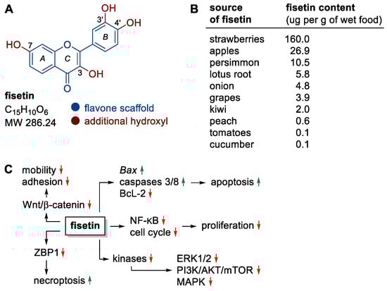 (A) Structure of fisetin, (B) fisetin content in fruits and vegetables, (C) selected molecular targets/processes stimulated (green) or inhibited (red) by fisetin.