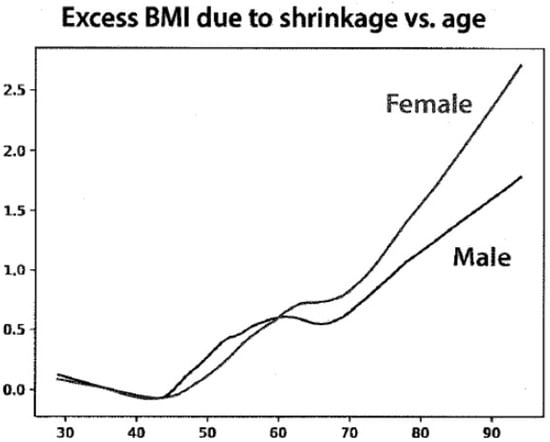 Neither height nor age are considered independent risk factors in calculating BMI, yet height decreases as age increases over the age of 50. Sorkin summarized the results of 16 studies that reported data for subjects up to 80 years of age, finding that from the age of 30 years, men lost an average of 5 cm and women 6 cm in height []. This loss in height could account for an average increase in BMI of ~1 kg/m2 by age 70. A weight reporting bias has been well recognized [], but the height reporting bias did not change with time, which seems inconsistent with the documented loss in height beginning in the 4th decade. People appear unaware of their increasing loss of height with age. This failure to note a loss of height may be related to the fact that about half of the reduced stature of older individuals is a birth cohort effect, while the other half is an actual decrease in height after the age of 40 years [].