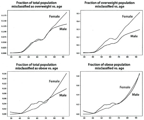 Fraction of study population misclassified as overweight or obese, determined as described in Methods. The X axis represents the age in years, and the Y axis represents the fractions misclassified.
