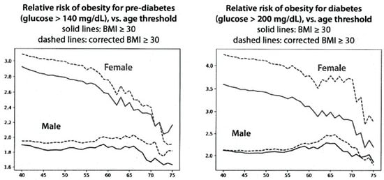 Figure 4 (left panel) shows the relative risk of obesity for having pre-diabetes. Obese women at age 50 have about a 2.8-fold increased risk of having pre-diabetes compared to non-obese women. The dashed line shows that the risk is somewhat higher for women who are classified as obese, corrected by using their young height. The difference for males is similar, although the shape of the curve as a function of age differs. The right panel of Figure 4 shows the relative risk of obesity for having diabetes. The differences for diabetes in women are somewhat greater than for men for pre-diabetes. In all cases, however, the risk for elevated blood sugar at a given age is greater when the BMI is calculated using the height correction than it is using the current BMI.