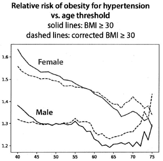 The correlation of hypertension as a function of age, using current and corrected BMI in males and females, is shown in Figure 5. After the age of 55 years for males and 60 for females, the relative risk of having hypertension using the corrected BMI was increased and progressively became greater with age, although the curves are moving differently for males and females. These differences, however, are consistent with the data for blood sugar shown in Figure 4.