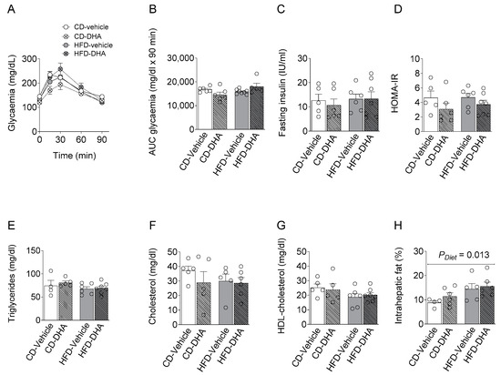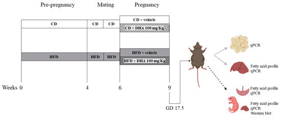 Experimental design (Figure 1): Female mice were fed the respective diets for 4–6 weeks until HFD animals gained 20% of their initial body weight. Then, the estrous cycle was monitored via vaginal smears daily. On the morning of the proestrus phase, female mice were placed with male mice with proven fertility. The next morning was considered as gestational day (GD) 0.5. The body weight and food intake were recorded weekly. From GD 6.5 until GD 17.5, a subgroup of CD and HFD dams was supplemented orally with DHA (D2534, Sigma Aldrich, St. Louis, MO, USA) at a dose of 100 mg/Kg/day dissolved in sunflower oil (sc-215936, Santa Cruz Biotechnology, Dallas, TX, USA) as the vehicle conforming CD-DHA (n = 7) and HFD- DHA (n = 7) groups, respectively. Control groups received isovolumetric amounts of sunflower oil conforming CD-vehicle (n = 6) and HFD-vehicle (n = 8). At GD 17.5, an oral glucose tolerance test was performed in all dams. Then, they were anesthetized with isoflurane and euthanized via cardiac puncture. Fetuses and placentas were obtained via laparotomy, dried, and weighed. Then, the fetal liver was removed and weighed. In total, forty-two (15 females and 27 males) fetuses were obtained in CD-vehicle group, 44 (25 females and 19 males) in CD-DHA group, 50 (20 females and 30 males) in HFD-vehicle group, and 46 (23 females and 23 males) in HFD-DHA group. All analyses were performed in one or two fetuses per sex in each litter to avoid the litter effect. Maternal liver and adipose tissues were also collected and weighed. Each organ was snap-frozen in liquid nitrogen and stored at −80 °C. Maternal blood was centrifuged at 10,000 rpm for 10 min to obtain serum.