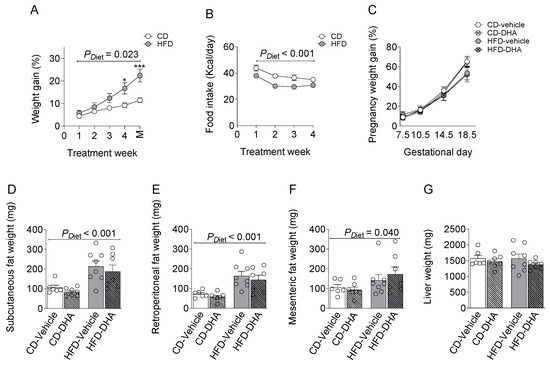 Characterization of dams fed with a control diet (CD) or high-fat diet (HFD) and treated with vehicle (sunflower oil) or docosahexaenoic acid (DHA) during pregnancy. (A,B) Pregestational weight gain and food intake; (C) gestational weight gain; (D–F) subcutaneous, retroperitoneal, and mesenteric fat depots; (G) maternal liver weight. Values are means ± SEM. Two-way ANOVA followed by Sidak’s post-test was performed to calculate the differences. *** p < 0.001 and * p < 0.05 between CD and HFD. M = mating.