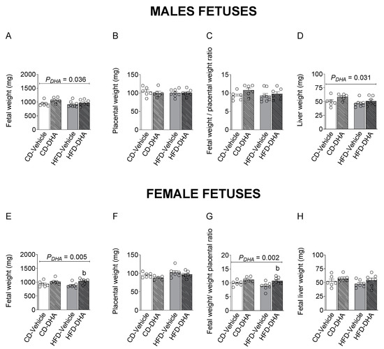 Biometric measurements in fetuses from dams fed with a control diet (CD) or high-fat diet (HFD) and treated with vehicle (sunflower oil) or docosahexaenoic acid (DHA) during pregnancy. Fetal and placental weight, fetal–placental weight ratio, liver weight, and liver–body weight ratio in male (A–D) and female fetuses (E–H). Values are means ± SEM. Two-way ANOVA followed by Sidak’s post-test was performed to calculate the differences. b p < 0.05 between HFD-vehicle and HFD-DHA groups.