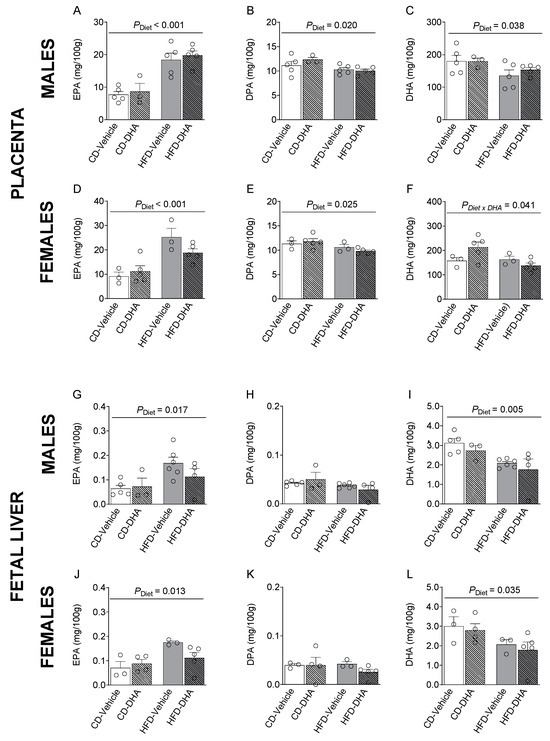 In the male liver, the main effects of the diet were observed in the levels of lignoceric acid, GLA, and the GLA to LA ratio, which was lower in fetuses from dams fed with the HFD than the CD (Supplementary Table S6). In female fetuses, we found a main effect of diet with lower levels of erucic acid in the HFD compared with the CD (Supplementary Table S7). Also, DHA had a main effect in male fetuses, with lower levels of behenic acid (C22:0). In this regard, in the HFD group, palmitoleic acid and total MUFA were lower in fetuses from mothers that received DHA compared with those that did not receive it. An interaction between diet and DHA was observed in OA and total MUFA (Supplementary Table S7). Interestingly, the HFD had a main effect on EPA, which was higher in the HFD than in the CD in both male and female fetuses (Figure 5G–J). However, DHA was lower in fetuses of both sexes from dams fed with the HFD (Figure 5I,L). Moreover, in males, total PUFA and n-3 PUFA were lower in the HFD than in the CD (Supplementary Table S6).