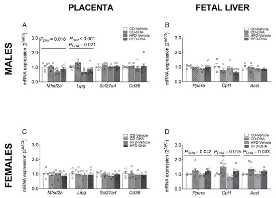 Pro-inflammatory environments have been associated with abnormal maternal–fetal FA transfer [22]. Then, we analyzed the mRNA expression of pro-inflammatory cytokines, including tumoral necrosis factor alpha (Tnfa), interleukin-6 (Il6), and monocyte chemoattractant protein-1 (Mcp1), in the maternal adipose tissue and liver to test if an HFD and DHA administration could explain the changes observed in FA composition in fetal livers. Moreover, we tested in the placenta the gene expression of endothelial lipase (Lipg) because of its role in the hydrolysis of triglycerides to release FAs to be transported, the fatty acid transporter 4 (Scl27a4) and fatty acid translocase (Cd36), due to their participation in FA transport; in addition, we included major facilitator superfamily domain containing 2A (Mfsd2a) given its relevance and specificity in the transport of DHA [23]. In the fetal liver, we assessed the expression of genes encoding for proteins related to regulators of FA metabolism, such as peroxisome proliferator-activated receptor alpha (Ppara) and acetyl-CoA carboxylase alpha (Acaca); genes associated with lipogenesis, such as sterol regulatory element binding transcription factor (Srebf), acyl-CoA oxidase (Acox), and fatty acid synthase (Fasn); and those related to FAO, such as carnitine palmitoyltransferase I (Cpt1), long-chain acyl-CoA synthetase 1 (Acsl1), and acyl-CoA oxidase (Acox) [24]. Moreover, 5-lipoxygenase (5-Lox) participates in the biosynthesis of pro-resolving lipid mediators derived from DHA [25].