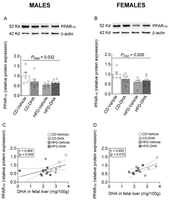 In male and female fetal livers, a main effect of diet caused a decreased protein expression of PPAR-α (Figure 7A,B). Interestingly, a positive correlation between PPAR-α and DHA content in the fetal liver was found in both males and females (Figure 7C,D).