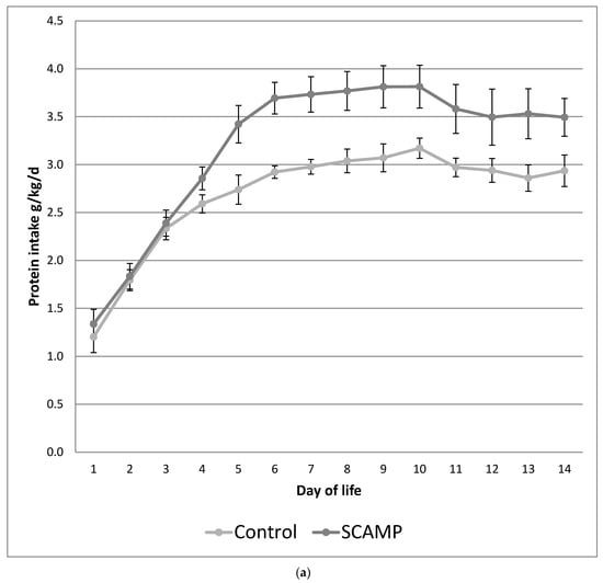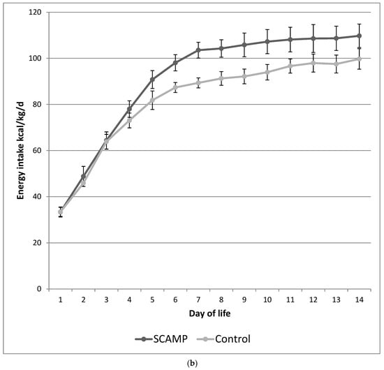 (a) Mean daily protein intake (g/kg/day) over the first 14 days of life in SCAMP versus control infants undergoing neurodevelopmental follow up. Error bars represent 95% confidence intervals for the mean. (b) Mean daily energy intake (kcal/kg/day) over the first 14 days of life in SCAMP versus control infants undergoing neurodevelopmental follow up. Error bars represent 95% confidence intervals for the mean.