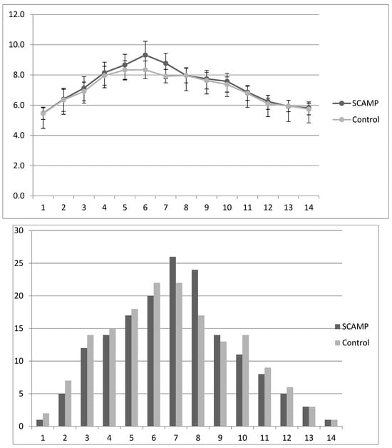 Table 5 shows that there was no difference in mean daily blood glucose (mmol/L) in the first 14 days of life, although there was a difference on day 6 (the peak mean daily blood glucose level) of borderline statistical significance. Insulin supplementation was only marginally higher in the SCAMP group (not statistically significant). The details of this finding are shown in Figure 3. In those that received insulin, the median (IQR) total dose received was 5.4 (2.7–11.7) versus 7.7 (2.2–13.9) IU/kg in the SCAMP and control groups, respectively. Again, the subgroup undergoing neurodevelopmental assessment reflected these findings, and the 24–26-week stratum showed higher insulin treatment rates without a difference between the groups.