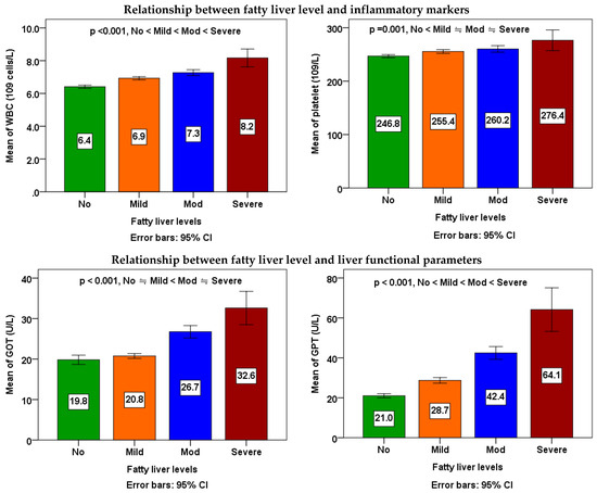 According to Table 3 and Figure 1, to examine the differences between the averages of four different levels of fatty liver, a one-way analysis of variance (ANOVA) was conducted. The mean of each metabolic parameters, inflammatory markers, and liver functional parameters in the four different fatty liver subgroups among workers was significantly different (p < 0.001). Workers with fatty liver may have a significant propensity toward the mean of each metabolic parameters, inflammatory markers, and liver functional parameters when compared to those without the condition. In Scheffe’s post-hoc comparison, waist circumference, WBC, and GPT showed a salient trend (p < 0.001); the data were increased along with higher severity of fatty liver. For FBG, triglycerides, HDL-C, systolic BP, and diastolic BP, all of the differences between any two subgroups were also significant, except those between the mod subgroup and the severe subgroup. For platelets, differences between non-fatty liver subgroups and the mild subgroup, mod subgroup, and severe subgroup were significant, except those between the mild subgroup, mod subgroup, and severe subgroup. For GOT, all of the differences between any two subgroups were also significant, except those between the non-fatty liver subgroup and the mild subgroup, as well as between the mod subgroup and the severe subgroup.