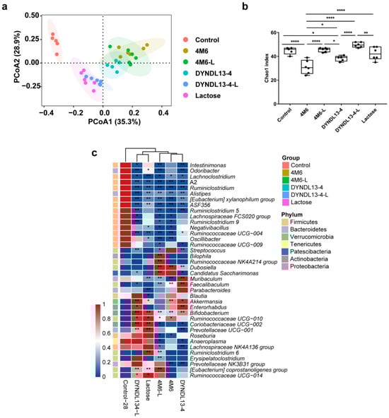 The changes in intestinal microbiota were further explored from fecal samples collected from the mice administered with S. thermophilus strains with and without lactose supplementation (4M6, 4M6-L, DYNDL13-4, and DYNDL13-4-L). PCoA of Bray‒Curtis distance of genus-level taxonomic profiles of these samples showed that all interventions altered the structure of the indigenous gut microbiota after 28 days of treatments (Figure 1a). Among these five groups, samples in the 4M6, DYNDL13-4, and 4M6-L groups showed a clear clustering, whereas the DYNDL13-4-L and lactose groups clustered together. This indicated that the ingestion of two S. thermophilus strains (4M6 and DYNDL13-4) introduced similar perturbations in the indigenous microbial community structure, and the regulation of DYNDL13-4 on gut microbiota was more affected by lactose than 4M6. Additionally, both 4M6 and DYNDL13-4 decreased alpha diversity relative to the control group, and those were restored under the supplement of lactose (Figure 1b).