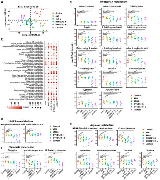 Among the metabolites of tryptophan metabolism in feces, indole-3-ethanol, indole-3-acetic acid, 3-methylindole, and serotonin were reduced in five treatment groups (Figure 2c). 2-Aminomuconate, involved in kynurenine catabolic metabolism, was lowered only in 4M6-L and DYNDL13-4-L, with a reduction of L-tryptophan in groups containing lactose consumption (lactose, 4M6-L, and DYNDL13-4-L). Moreover, indole derivatives (including indole, 3-indole propionic acid, indole-3-pyruvic acid, methyl indole-3-acetate, and 4-indolecarbaldehyde) and kynurenic acid decreased in DYNDL13-4-L, which had a similar trend with those in lactose group. In addition, other indole derivatives, such as indole-2-carboxylic acid and 5-methoxyindole, decreased exclusively in the lactose group. These results revealed that tryptophan metabolism was down-regulated to varying degrees by five treatment groups, and lactose supplementation enhanced these changes, especially in indole derivatives, with DYNDL13-4 more pronounced than 4M6. What is more, metabolites involved in arginine, histidine, and glutamate metabolism in DYNDL13-4 were also more influenced by lactose supplementation than those in 4M6 in feces (Figure 2d–f).