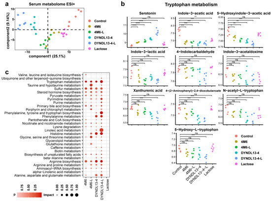Effect of lactose supplementation on serum metabolome induced by S. thermophilus ingestion is strain-specific. (a) PLS-DA score plots based on the serum metabolomic profiles in positive ionization modes; (b) Box and Whisker plots of serum metabolites on tryptophan metabolism; (c) the enrichment pathways established using 84 metabolites in serum samples on day 28 between each treatment and the control group. * p < 0.05, ** p < 0.01, *** p < 0.001, **** p < 0.0001. Pathway enrichment analysis revealed that tryptophan, sulfur, pyruvate metabolism, steroid hormone, unsaturated fatty acids, and arginine biosynthesis were enriched in the serum of the strain treatment groups (4M6, DYNDL13-4, 4M6-L, and DYNDL13-4-L) compared to the control group. More pathways were enriched in S. thermophilus strain groups with lactose supplement than the corresponding strain groups. The enrichment of taurine and porphyrin metabolism was observed in 4M6-L and DYNDL13-4-L, with no change in 4M6 and DYNDL13-4. Additionally, 4M6-L significantly enriched histidine and arginine metabolism relative to the 4M6, and DYNDL13-4-L remarkably enriched phenylalanine, tyrosine, and tryptophan biosynthesis and linoleic acid metabolism relative to the DYNDL13-4 (Figure 3c).