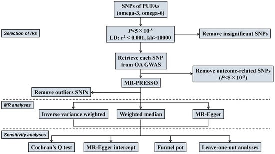 When selecting IVs for our MR analysis, we strictly followed three well-established assumptions: (i) IVs should exhibit strong associations with the exposure of interest; (ii) IVs should be independent of any confounding factors; and (iii) IVs should solely influence the outcomes through the chosen exposure, without having any direct associations with the outcomes themselves [24]. We first applied a genome-wide significance threshold (p < 5 × 10−8) to initiate the IV screening process for our MR study. Subsequently, we implemented SNP pruning within a window size of 10,000 kb, ensuring that the linkage disequilibrium (LD) between SNPs remained below the threshold of r2 < 0.001. Furthermore, the selected SNPs related to Omega-3 and Omega-6 fatty acids were retrieved from the GWAS data of the outcomes (KOA and HOA), and any SNPs significantly associated with the outcomes (p < 5 × 10−8) were excluded. In addition, we carefully assessed the IVs selected through the above process for any indications of weak instrument bias by using the F-statistic [25,26]. To mitigate bias stemming from weak IVs, we exclusively retained IVs with an F value surpassing 10, while those with an F value of less than 10 were discarded due to weak instrument bias [27].