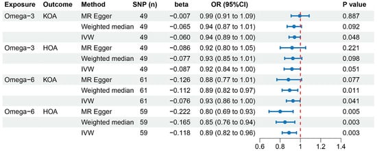 Figure 2 depicts the MR analyses examining the causal relationships between omega-6 fatty acids and OA risk. In total, 61 and 59 LD-independent and suitable IVs were chosen from GWASs for KOA and HOA (Supplementary Tables S2 and S3). The IVW method suggested that genetically predicted omega-6 fatty acids might be associated with a reduced risk of KOA (OR = 0.93, 95% CI: 0.86–1.00; p = 0.041). The weighted median analysis yielded similar significant results (OR = 0.89, 95% CI: 0.82–0.97; p = 0.011), while the MR-Egger analysis showed consistent but non-significant results (OR = 0.88, 95% CI: 0.77–1.01; p = 0.077). Given the significant results of the IVW and the consistent direction of beta values from the other two methods [22,37], these findings suggest that omega-3 fatty acids may have a causal association with a decreased risk of KOA. Simultaneously, our IVW method provided evidence of genetically predicted omega-6 fatty acids being associated with a reduced risk of HOA (OR = 0.89, 95% CI: 0.82–0.96; p = 0.003). Significant results were observed using both the MR-Egger (OR = 0.80, 95% CI: 0.69–0.93; p = 0.005) and weighted median (OR = 0.85, 95% CI: 0.76–0.94; p = 0.003) methods, aligning with the findings obtained through the IVW approach.