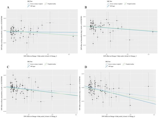 MR-Egger regression and IVW analyses were conducted to assess heterogeneity. Heterogeneity was observed in the MR analyses of omega-3 fatty acids for KOA (MR-Egger: p = 0.009; IVW: p = 0.005) and HOA (MR-Egger: p = 1.498 × 10−6; IVW: p = 2.304 × 10−6) (Table 2). Given the heterogeneity, using random-effects IVW estimation was appropriate in evaluating causality under these circumstances [41]. Nevertheless, the IVW results consistently supported the causal relationship between omega-3 fatty acids and KOA risk (Figure 2). Additionally, the MR-Egger intercept tests indicated no horizontal pleiotropy in any of the analyses, as all p values exceeded 0.05 (Table 2). The scatter plot illustrated the estimated impact of SNPs on omega-3 fatty acids and KOA/HOA (Figure 3A,B). Furthermore, the leave-one-out analysis demonstrated that no outlier instrumental variables significantly influenced the overall results (Figure 4A,B). The funnel plot of the omega-3 fatty acids and KOA/HOA analysis indicated no apparent horizontal pleiotropy, as the variation in effect size around the point estimate was symmetrical (Figure 5A,B).