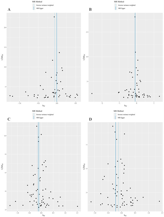 Funnel plots of SNPs associated with omega-3/omega-6 fatty acids and KOA/HOA. (A) Funnel plot for omega-3 fatty acids with KOA. (B) Funnel plot for omega-3 fatty acids with HOA. (C) Funnel plot for omega-6 fatty acids with KOA. (D) Funnel plot for omega-6 fatty acids with HOA. SNPs, single-nucleotide polymorphisms; KOA, knee osteoarthritis; HOA, hip osteoarthritis.