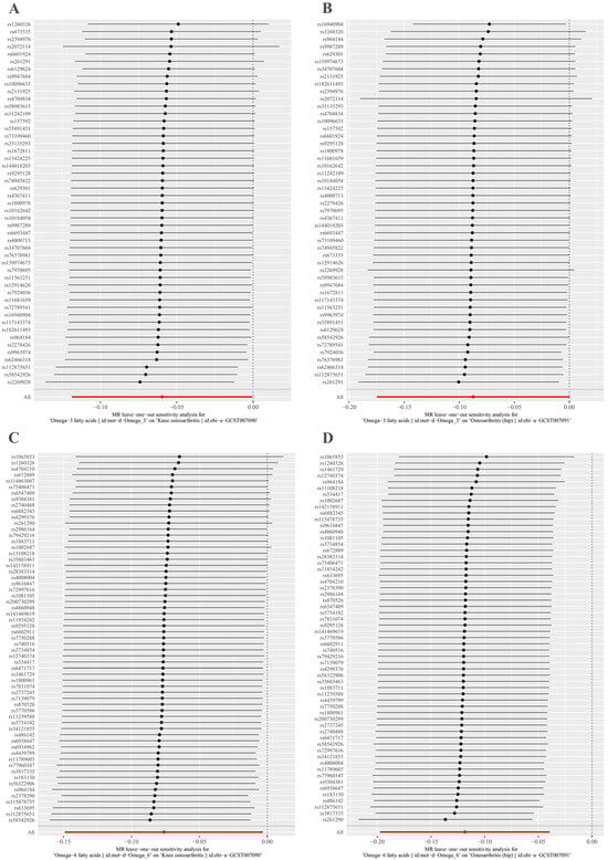 Leave-one-out plots to visualize the causal effects of omega-3/omega-6 fatty acids on KOA/HOA. (A) Leave-one-out analysis for omega-3 fatty acids with KOA. (B) Leave-one-out analysis for omega-3 fatty acids with HOA. (C) Leave-one-out analysis for omega-6 fatty acids with KOA. (D) Leave-one-out analysis for omega-6 fatty acids with HOA. KOA, knee osteoarthritis; HOA, hip osteoarthritis.
