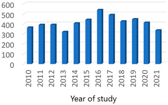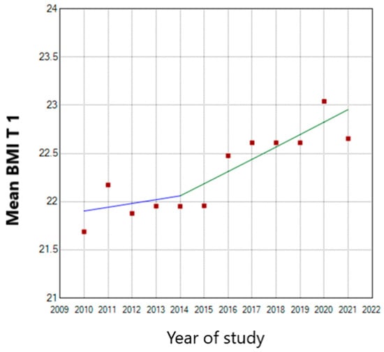 We detected an annual 0.57 BMI increase in nulliparous women in the first trimester of pregnancy. This increase started in 2013 and reached a maximum mean value in 2020 (Figure 6). The BMI increased annually by 0.18 until 2013.