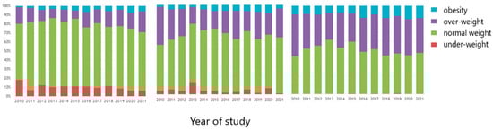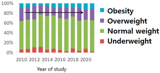 Overweight and obesity are defined using World Health Organization (WHO) criteria. BMI (body mass index) is calculated by dividing an individual’s weight in kilograms by the square of their height in meters. After obtaining their BMI value, we can classify the individual as being underweight with a BMI under 18.5; normal weight with a BMI that ranges from 18.5 to 24.9; overweight with a BMI from 25 to 29.9; or obese with a BMI above 30. Obesity is also classified into three stages depending on the BMI value: class I (BMI = 30.0–34.9), class II (35.0–39.9), or class III (≥40.0) [].