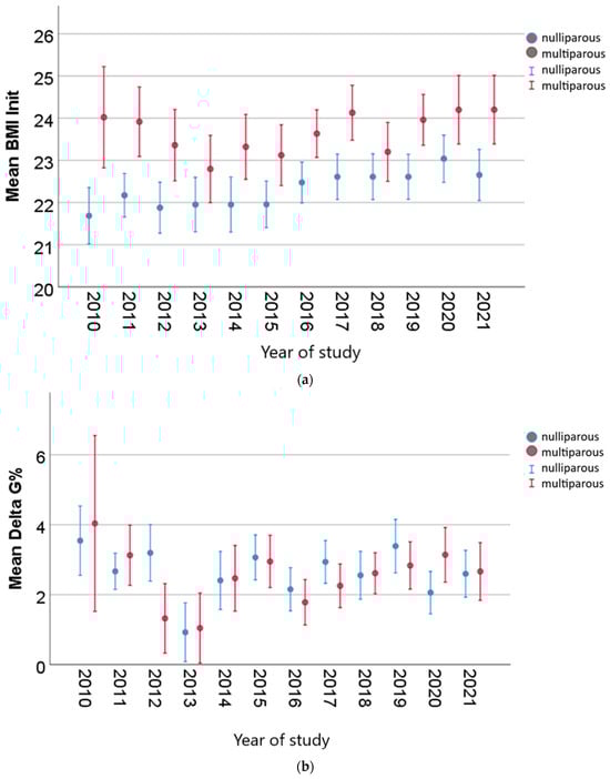 Weight gain (Delta G%) until the second morphological scan for both nulliparous and multiparous women ((a), initial BMI; (b) mean Delta G%, weight gain in the first trimester).