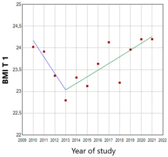 When analyzing the first trimester BMI tendency in multiparous women with the same joinpoint regression, we detected a significant annual 0.65 increase starting from 2013. The maximum value was reached in 2020 (Figure 7). During 2010–2013, the annual increase was 1.59 (Figure 8).