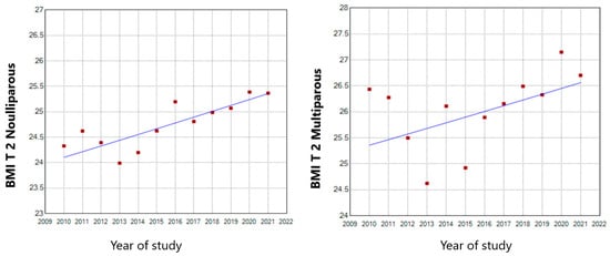 Second trimester BMI trends in nulliparous and multiparous pregnant women (T 2—second trimester of pregnancy).