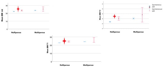 BMI trends depending on the type of conception (BMI_init—pregestational BMI; T1—first trimester of pregnancy; T2—second trimester of pregnancy; the red star indicated statistical significant results).