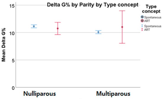 When evaluating pregestational BMI in nulliparous women depending on the type of conception, our results pointed out a significantly increased pregestational BMI in women with previous ART (assisted reproductive technology) procedures (IVF (in vitro fertilization) or ovarian stimulation) (Figure 10).