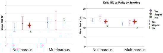 The pregestational and first trimester BMIs of smoking women did not differ so much from that of non-smoking ones, regardless of parity. However, when we analyzed weight in the second trimester of pregnancy, we detected a significantly higher BMI mean value in smoking patients and in patients who quit smoking during pregnancy compared with non-smoking ones. Smoking pregnant women seemed to have higher second trimester weight gain, regardless of parity (Figure 12).