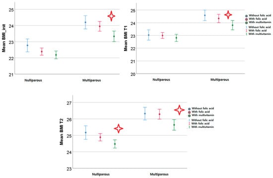 BMI trends depending on folic acid or multivitamin supplementation (BMI_init—pre-gestational BMI; T1—first trimester of pregnancy; and T2—second trimester of pregnancy; the red star indicated statistical significant results).